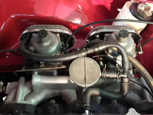 | Bonjour Paul, -Sur GT6 MK1/2 & premières MK3 : Bouchon ventilé avec tamis (ta photo) utilisé conjointement avec soupape de régulation Smith. -Sur dernières MK3 : Bouchon non ventilé, pas de soupape Smith, cache-culbus avec tamis intégré (bossage) et T de recirculation via 1 piquage sur chaque carbu. cdlt :) |