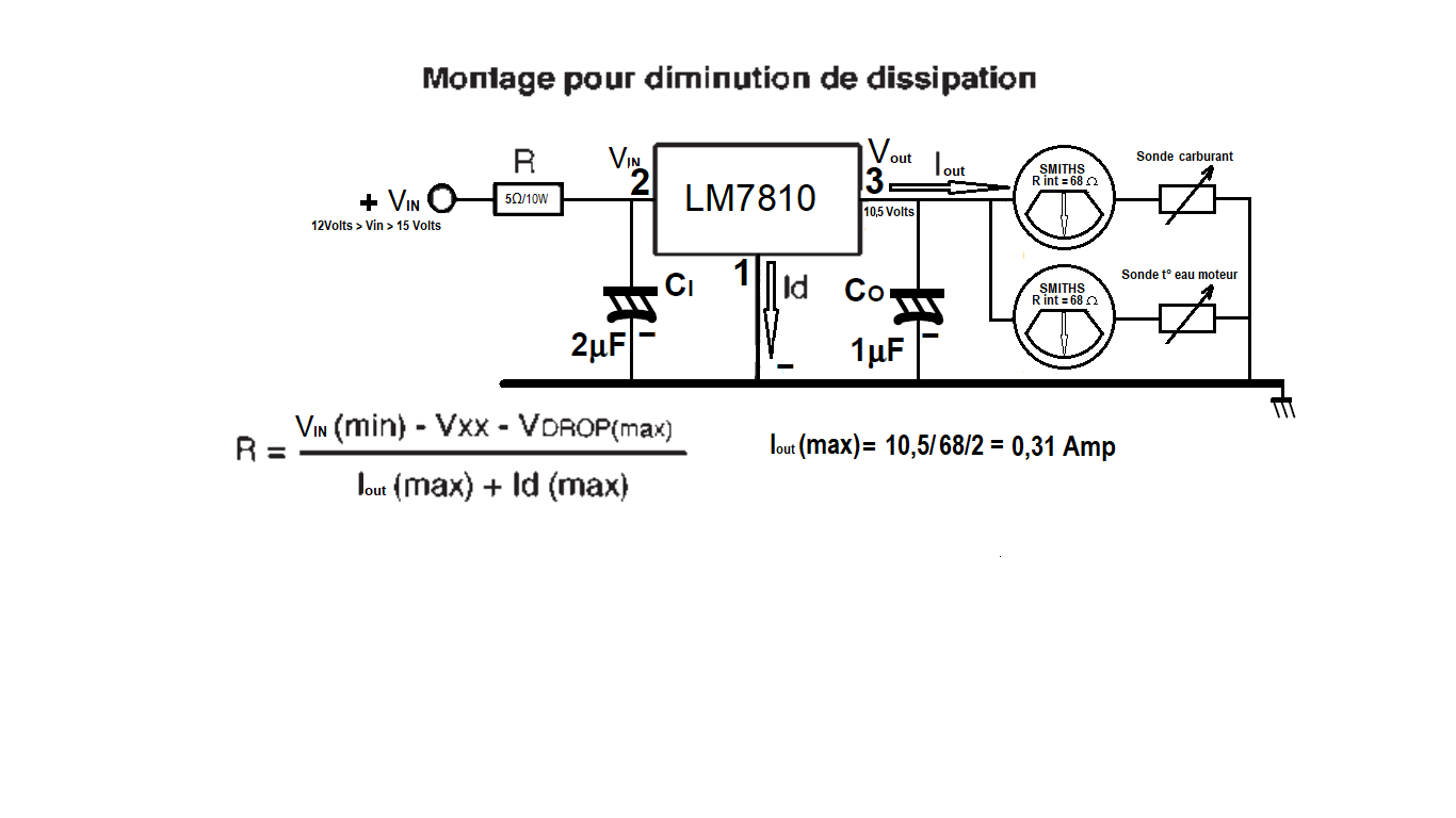 D'autre part la résistance de 5 Ohm visible dans le pdf ci-dessus n'est pas nécessaire, le 7810 bien vissé sur la masse peut largement dissiper la chaleur, de plus il y a une erreur de sens dans les symboles, il faut lire des < et non des > en haut à gauche.