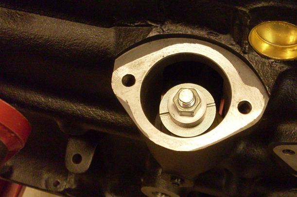 Pour sonder le conduit central (alimentant le palier central vilo) à partir du côté contacteur de pression d'huile, il faut déposer la pompe à huile, le pignon de renvoi et extraire la bague vers le haut du bloc par vissage (tige filetée/rondelles/entretoises/écrous), surtout pas au choc! au risque de l'endommager car elle est très fragile (alésage et surtout sa mince collerette supérieure) donc gaffe également à la repose de ne pas forcer l'emmanchement et de bien positionner les points de pression.