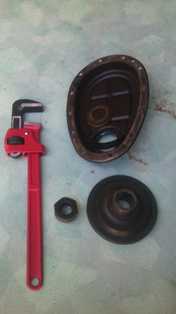 | Bonjour, Comme il faut également que je vérifier ce moteur en profondeur, j'ai viré la pompe à eau + poulie de ventilo et le GROS radiateur pas d'origine. Du coup c'est pas mal, j'ai eu de la place pour bricoler. - Dégrippant choc thermique sur l'écrou de vilo. - 24h d'attente. - Achat d'une clé à griffe (merci du conseil ;-) 25 balles chez Weldom). - 4ème vitesse, frein à main, bougies remontées et tout ce qui faut pour la compression. - 1er essai, BINGO (à mon avis il n'y avait pas les 20 kg de serrage). VICTOIRE. Voir photos pour l'état de la distri, je vais commandé un kit pour remettre ça à neuf + tous les joints que je ....n'ai pas....trouvé sur mon passage :-). |