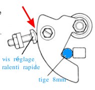 Pour régler: Intercale une tige/vis de 8mm de diamètre (en bleu sur le schéma) entre la came et sa butée sur le carbu.