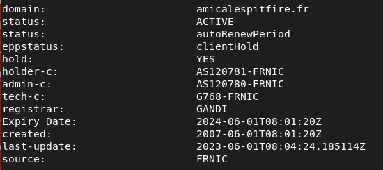 | Bonjour, Il semble s’agir d’un oubli de renouvellement du nom de domaine par l’association, domaine qui a exprimé le 1er juin dernier (cf. capture d'écran du "whois" : le statut est "clienthold", donc en attente de réaction du client). Il suffit que le responsable technique de l’Amicale renouvelle l’abonnement auprès du prestataire (Gandi, qui a donc du envoyer un mail avec un lien pour le paiement, accessible même si on a perdu le code d’accès à l’espace client. C’est un registrar sérieux :-) ). |