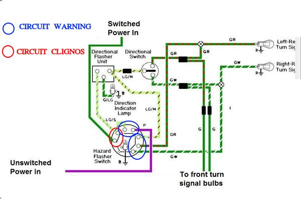 | Warning actionné, en testant sur l'inter la borne correspondant au fil vert filet blanc, tu devrais avoir 12V en intermittence puisque sauf erreur de ma part ce fil est le seul à alimenter les 4 clignos en même temps. (sur 1er schéma) |