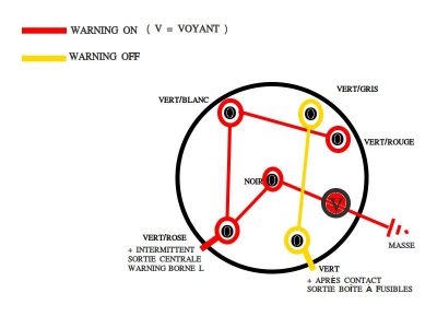 | bon , on avance mais ce n'est pas encore parfait ! Pas de tension sur la borne correspondant au fil vert filet blanc. En soulevant légèrement la lame correspondante ça a fonctionné !!!! mais malheureusement seulement le coté gauche ;-(( Donc les clignotants AV/G et AR/G fonctionnent en mode "feux de détresse". Pourtant les AV/D et AR/D fonctionnent bien en mode " feux clignotants" ! Ton avis ? |