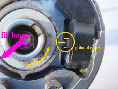 J'ai oublié de préciser: pointe de roue alignée sur l'entrée de zone du capteur(photo), ton doigt d'allumage doit pointer vers un plot de la tête d'allumeur. Sur ce plot installe le fil de la bougie N°1 (et complète la pose des fils suivants sur la tête dans l'ordre d'allumage: 342 ,en suivant le sens anti-horaire). Bon courage :) |