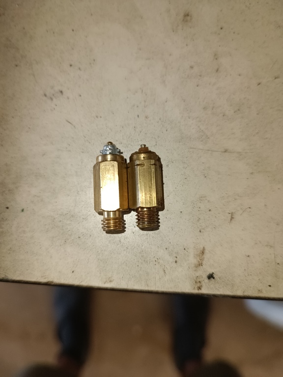 Tommybolin, j'ai remplacé ce pointeau de gauche par un pointeau (et son puits) comme celui de droite. Les ratés sont toujours présents. Ce matin, j'ai monté des carbus prêtés par un ami, le symptôme est toujours le même, pétarade et retours d'explosion dans le carbu avant, donc cylindres 1 er 2. Pour info, c'était la bougie du cylindre 2 qui était tachetée de blanc.