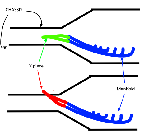 Difficile d'avoir des réponses de Bell qui fait plutôt l'autruche. Pour l'instant la seule réponse que j'ai eue est : pour le point 2 fixer le collecteur sur le moteur et tirer sur la partie basse pour la redresser (facile mais c'est plutôt rigide). Pour le 3, monter la pièce en Y dans l'autre sens, chose que j'ai bien sûr testée mais c'est tout simplement impossible actuellement (voir dessin), on est complètement dans le châssis.
