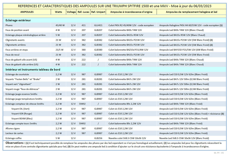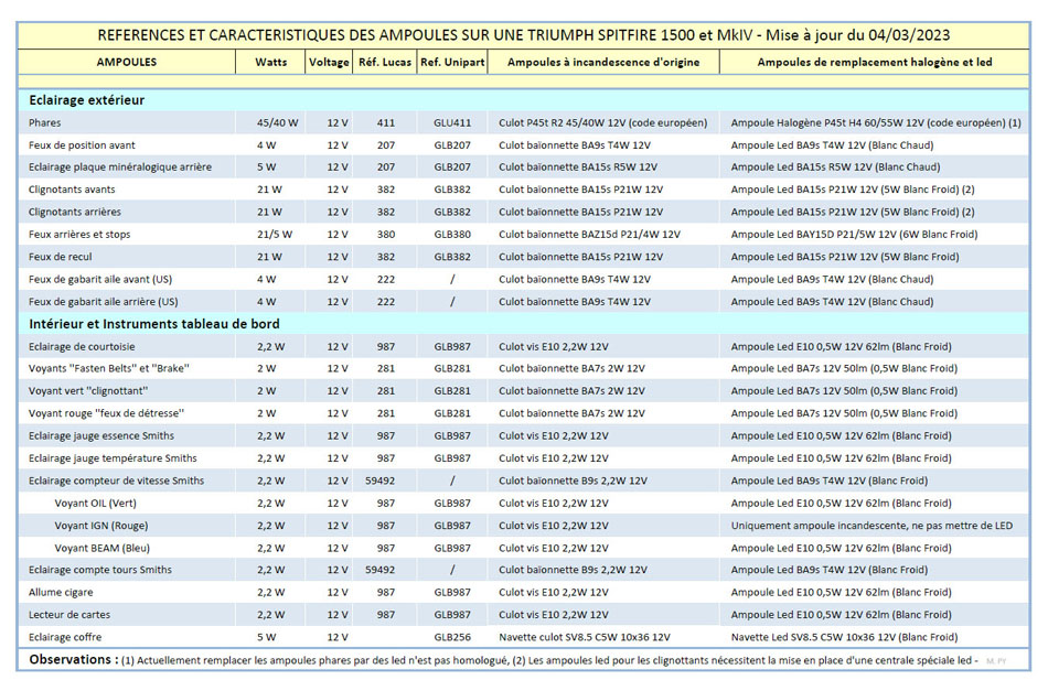 | (Le fichier "2023.03 - Spitfire 1500, Ampoules, références et caractéristiques M. PY V5.pdf" est trop volumineux ou le nombre d'élement maximum est dépassé et n'a pas été enregistré) Bonjour, Le tableau des caractéristiques des ampoules complété et mis à jour au format pdf en espèrant que ça va passer ! Bien amicalement |