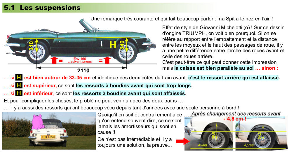 | Oui, ça. Chez spitfire, herald, etc le ressort est placé sur le plateau de l'amortisseur. D'origine le plateau est tj sur le même hauteur. Mais les anglais qui aiment des planchers sur le tarmac ont construit des amortisseurs avec le plateau monté plus bas. Le nom: Spax. Ca change énormement le hauteur de la voiture avec le même ressort. |