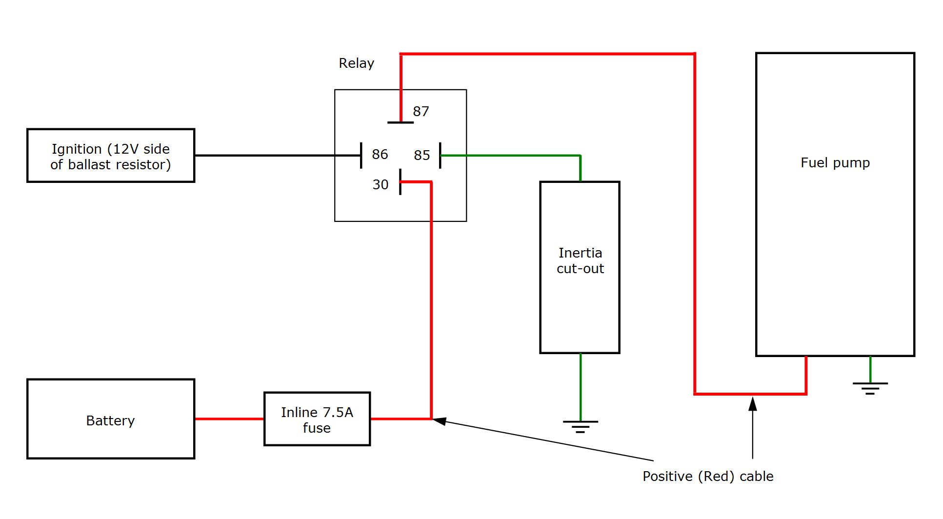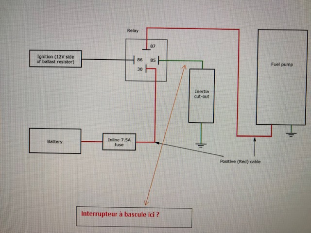 | J'ai oublié 2 questions : - Je souhaitais positionner l'interrupteur "sur le fil de masse" de la pompe à essence, qu'en dites vous ? - Quelle intensité pour le fusible ? ( P=U.I ), U 12-14volts mais je n'ai pas la puissance de la pompe pour déterminer I ... Je voyais 5A / 7A maxi ? |