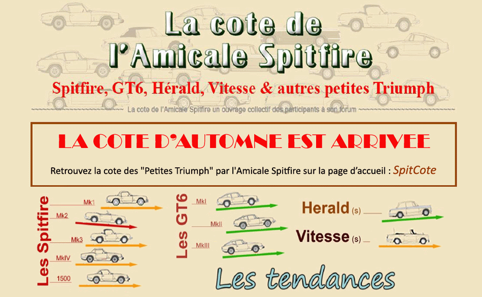 ![]() LA COTE DE L’AMICALE - ANALYSE DU MARCHE A L’AUTOMNE 2022 Les chiffres ont parlé et de leur distillation est sortie la mise à jour de SpitCote, version automne 2022… Sans être un grand cru, les résultats sont honorables compte tenu du contexte. On pourrait même parler d’une stabilité globale des prix mais en y regardant de plus près il est possible de mesurer quelques mouvements tels une petite baisse de la cote des Spitfire Mk2, une légère tendance haussière de la GT6 mais surtout une poussée de fièvre des Herald qui confirme les frémissements déjà identifiés depuis quelques années. Juste reconnaissance pour ce sympathique cabriolet familial dont la hausse confirmée du prix est souvent justifiée par quelques belles restaurations, quant à la Triumph Vitesse, sa grande sœur, l’offre reste réduite et sa cote paraît marquer le pas actuellement. On constate dans les annonces une nette augmentation de la mention « Carte Grise de Collection » qui semble être utilisée aujourd’hui comme un argument de vente, par ailleurs, si le volume des offres a diminué depuis 2020 il reste cependant d’un bon niveau avec plus de 210 Spitfire proposées en moyenne chaque mois sur le marché. Pour qui cette petite Triumph ? Si l’on s’amusait à associer une voiture à un profil, on pourrait imaginer la Spitfire 4 pour les puristes qui exigent l’originale et faute d’en dénicher une la Spitfire Mk2 contentera celui qui souhaite de l’authentique sans attendre de dénicher le graal. Quant à la Spitfire Mk3 elle serait le bon compromis pour celles et ceux qui sont sensibles à sa livrée encore classique tout en intégrant un peu plus de praticité. La MkIV avec sa motorisation éprouvée dans une robe modernisée plaira aux raisonnables et pour ce qui est de la Spitfire 1500 et sa mécanique plus dynamique elle conviendra à ceux qui apprécieront sa vivacité dans un confort amélioré… Si la Herald va à ravir à la petite famille qui veut profiter d’un joli cabriolet anglais pour les balades familiales il sera aussi possible de la rendre plus sportive en choisissant la Triumph Vitesse et le ronronnement de son 6 cylindres tandis que la GT6 qui a sorti ses muscles conviendra aux durs, aux tatoués… Enfin je dis ça mais j’ai rien dit !!! Bref, on peut dire qu’il y a des petites Triumph pour tous les goûts et chacun pourra donc trouver celle qui lui correspond moyennant de débourser entre 10 et 20 000 € selon le modèle pour un exemplaire en bon état dont il pourra profiter tout de suite quitte à prendre plus tard le temps de le magnifier. Alors maintenant, roulez, roulez petits bolides ! SpitCote Retrouvez SpitCote, la cote des "Petites Triumph" par l'Amicale Spitfire à partir de la page d'accueil de notre site dans la rubrique « Les incontournables » ou si vous voulez y accéder directement en cliquant sur le lien qui suit : http://www.amicalespitfire.fr/spitcote/cote_active.php |