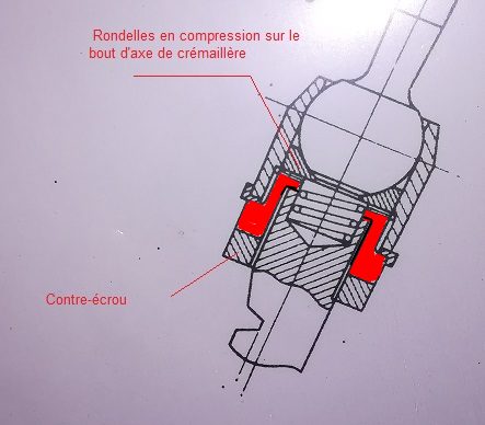 | Bonsoir Domi, Il faut assembler tous les éléments de la rotule sans le calage pour déterminer à peu près le jeu. Ensuite caler de façon à obtenir un jeu nul ou maxi 0,05mm lorsque le gros écrou est bloqué contre l'écrou épaulé (avec la rondelle-frein neuve intercalée entre les 2). La biellette doit pouvoir pivoter dans tous les sens sans gripper/forcer. Quand c'est ok, rabattre les oreilles de la rondelle-frein de chaque côté. Ensuite installer le ressort de pression en place et bloquer l'ensemble biellette en butée contre le barreau de créma (par l'écrou épaulé) puis bloquer le contre-écrou tout en maintenant l'écrou épaulé. cdlt :) |