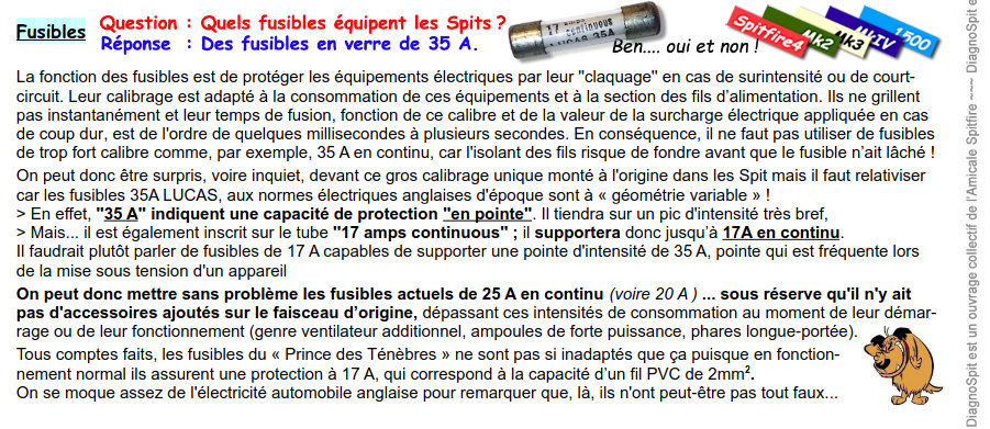 | Bonjour, toutes nos Spit utilisent des fusibles en verre Lucas 17/35A (capacité de 17A en continu, et de 35A en pic ponctuel). Références d'origine : Lucas 188218 / Stanpart 58465 Disponibles chez tous les revendeurs de pièces pour voitures ou motos anglaises : https://www.canleyclassics.com/?diagram=triumph-spitfire-mkiv/1500-fuse-fuse-cover-courtesy-switch-seat-sensor-control-box-reverse-light-switch-buzzer&ptno=GFS35 https://rimmerbros.com/Item--i-GFS3035 https://www.limora.com/fr/fusibles/15435/ https://www.datch.fr/fr/mini-mg-triumph-fusible-en-verre-30x55mm-35-amperes-p-68578.html?cPath=2_39_3912_391214 https://www.betaset.fr/faisceau/4776-jeu-de-5-fusibles-35a.html https://www.moss-europe.fr/fusible-35a-glass-gfs35x.html |