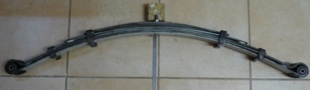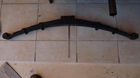 J'ai besoin d'un conseil pour remonter les lames de suspension arrière (Spitfire Mk2). Après le démontage (sans PB particulier), j'ai démonté les lames (8 lames : 7 + 1 qui visiblement n'était pas d'origine : courbure plus plane). J'ai mis des cales en téflon entre les lames et ré-assemblé les 7 lames (je n'ai pas remise la huitième). La flèche est passé de 120 mm à 147mm. En replaçant les lames dans la voiture : ca passe tout juste, je me demande comment procéder pour compresser les lames. En effet, je ne peux pas remettre les goujons et plaque de maintien des lames sur le pont : les lames sont bien trop hautes à cet endroit. Je précise que je n'ai pas mis les boulons aux extrémités des lames (sur les fusées) mais les extrémités des lames ne peuvent déscendre beaucoup : les durites gênent. Comment procéder vous avec des lames avec une tel cambrure ? Merci pour vos conseils, 1er photo : lames avant désassemblage : flèche de 120mm |
