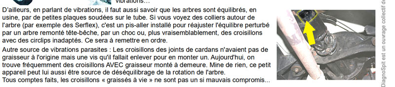 | Ma Spit nouvellement achetée, à l'occasion d'un essai avec Jean-Yves 44, celui-ci avait remarqué qu'il y avait une résonnance apparaissant à certains régimes. En plus de ce bruit sourd, on ressentait une vibration en posant la main sur le tunnel d'arbre. Il m'avait conseillé de vérifier que la ou les plaquettes d'équilibrage fixée(s) à l'origine sur l'arbre étai(en)t bien toujours là. Bonne pioche; il restait deux points de soudure mais plus de plaquette... Dépose de l'arbre. Rééquilibrage de celui-ci dans un atelier spécialisé pour poids-lourds. Remontage de l'arbre. Symptômes disparus. L'Amicale est une grande famille , JYP ;o) |