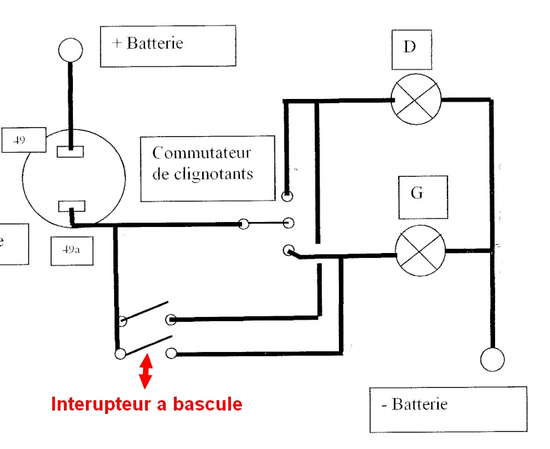 | en fait mon schema electrique est legerement doifferent. Les diodes en 5Watts me permettent d utiliser un interruteur simple LUCAS. Sur le schema ramplacer le double bascule par simple, a la sortie dedoubler les fils poser les diodes, acheter 2 connecteurs a 4 plots pour les connecter au cligno en remplacent le connecteur simple dorigine par les doubles ( 1 par cote ). possible de raccorder le voyant vert. Sur aliexpress il existe des voyants double ou triple couleur, tres jolie en diametre 16, ils passent tres tres bien sur le TdB a la place de la lentille verte. |