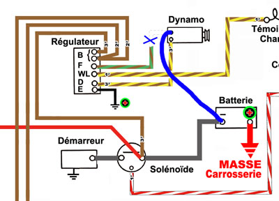 | précision ccernant la polarisation à partir du régulateur: il faut titiller la borne "F" du régulateur et non celle de la dynamo.. :) | |