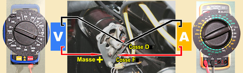 ![]() Voici les deux multimètres avec leurs réglages et leurs pointes sur le corps de la dynamo en masse positive et les cosses mâles D ef F. Ils sont utilisés ensemble. > Test 3 = 1.4 volt à 1500 tr/min et 1,9 à 2000 > Test 4 = 4 ampères à 1500 et 6 à 2000, ... mais je ne vois pas la tension bouger sur le premier multimètre pour monter jusqu'à 12 volts comme le dit la notice. En plus, il est dit que l'ampérage devrait approcher les 2 ampères alors qu'il les dépasse largement. Diagnostic, Docteurs ? |