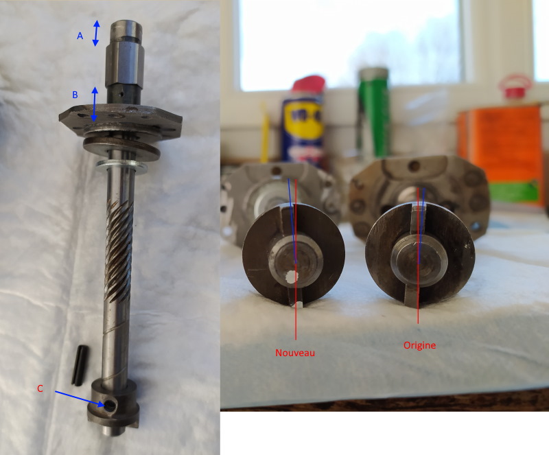 ![]() J'ai profité de ce samedi après-midi pour continuer à travailler sur mon allumeur en repartant d'un nouvel axe complet pas tout à fait équivalent : j'ai repris au tour les longueur A (5mm env + Modif de l'encoche du doigt en profondeur) et B (quasi 1 cm je crois) l'objectif étant de retrouver le doigt et les cannelures d'entrainement du pignon du compte tours à la même position une fois l'arbre montée. J'ai fait sauté l'avance centrifuge et j'ai collé + goupillé le manchon avec l'encoche pour qu'il ne puisse plus tourner. J'ai contre-percé également l'arbre au niveau du 'pignon' d'entrainement, l'arbre neuf n'en ayant pas : bon là ça s'est gâté. Je pense que mon montage a bougé au moment du perçage ... ou je me suis aligné sur un mauvais repère. Bref je me retrouve avec un angle quasi inversé par rapport au montage d'origine (3 à 7° dans le manuel). A bien y regarder, je pense que c'est jouable de le monter tel quel : il faudra probablement que je tourne un peu plus l'allumeur, et si éventuellement j'ai un problème avec le câble du compte tour, je pourrais peut-être décaler le pignon d'entrainement qui se reprend sur l'AAC d'une dent (à voir parce qu'il n'y en a que 13 de mémoire, donc un décalage de 27°). Cela étant j'aimerais avoir votre avis sur la question svp, peut-être que je ne vois pas tous les tenants et aboutissants. Dans tous les cas je ferai un montage à blanc une fois le moteur récupéré avec ancien et nouvel arbre avant assemblage définitif de l'allumeur pour voir ce qu'il en est réellement. Amicalement, Marco |