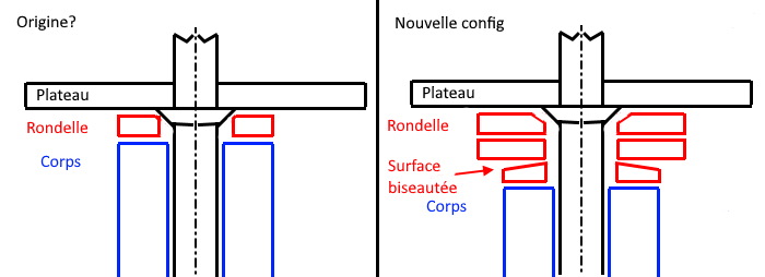 ![]() Bon par contre en essayant de bouger la tige à la main un peu plus fortement, maintenant ça bouge (bizarrement d'ailleurs), mais c'est percé (je souffle dans le vide). Je pense que je ne vais tout simplement pas le remonter, au point où j'en suis. @Tommy : pour les patins, ils sont tous là. Je penses pouvoir intercaler une ou deux rondelles. Pourquoi pas pour la photo, même si j'ai aujourd'hui une légère préférence pour le rivet. Quelle est la position du plateau théorique en statique? La photo est celle que j'ai prise au démontage. La position du plateau à l'air "médiane" (il peut tourner autant d'un côté que de l'autre). @Qui et Jean : merci. @Qui : un peu d'humour fait du bien. Amicalement, Marco |