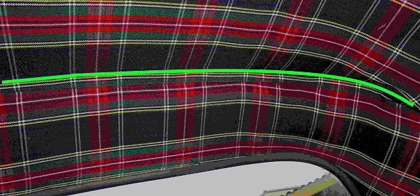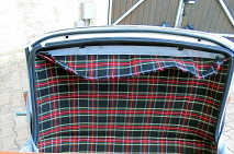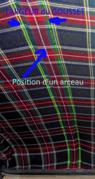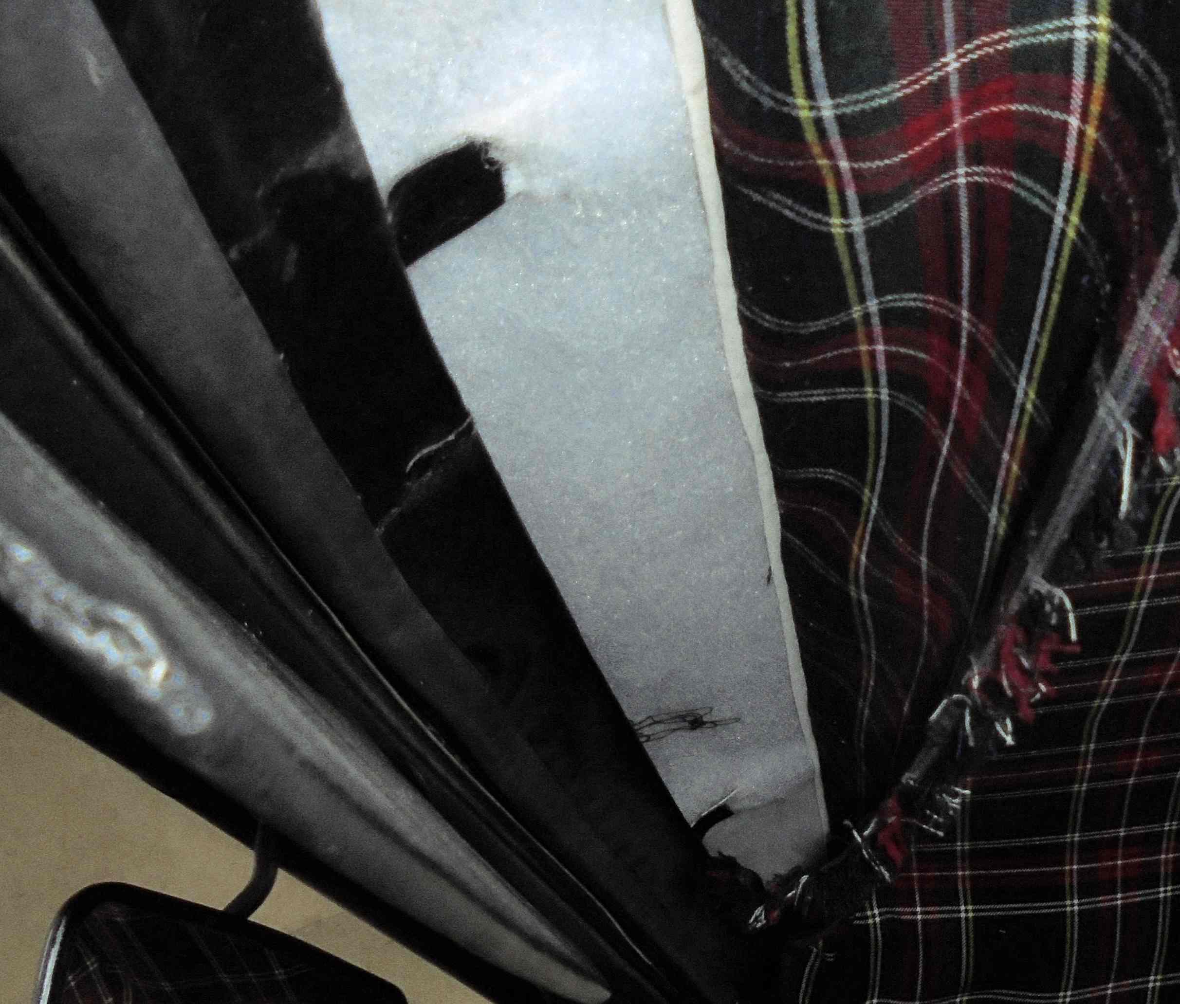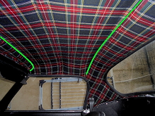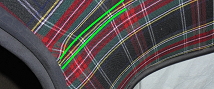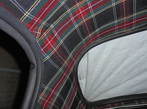 | (Le fichier "HT6.jpg" est trop volumineux ou le nombre d'élement maximum est dépassé et n'a pas été enregistré) Ce gousset doit être bien centré sur l'axe des arceaux de suspension du hard top. Il ne doit pas être baillant, il faut juste appliquer bien à plat une bande de tissu (idéalement un peu moins épais que l'écossais ici, mais on peut le faire dans le même tissu, mais il faut éviter de les réaliser dans un tissu plus résistant, sinon des plis se verront plus facilement. Maintenant que les axes du toit et du tissu sont repérés il faut les superposer. |