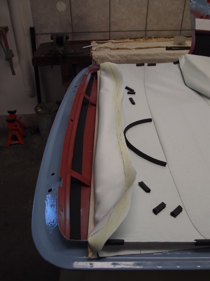 | On achève de tendre le tissu avec la pose des joints. Il faudra penser à bien araser le tissu au rebord interne de la carrosserie pour ne pas que les fibres de tissu ne se retrouvent du coté extérieur à pomper la pluie en cas d'intempéries. C'est fini !!! |