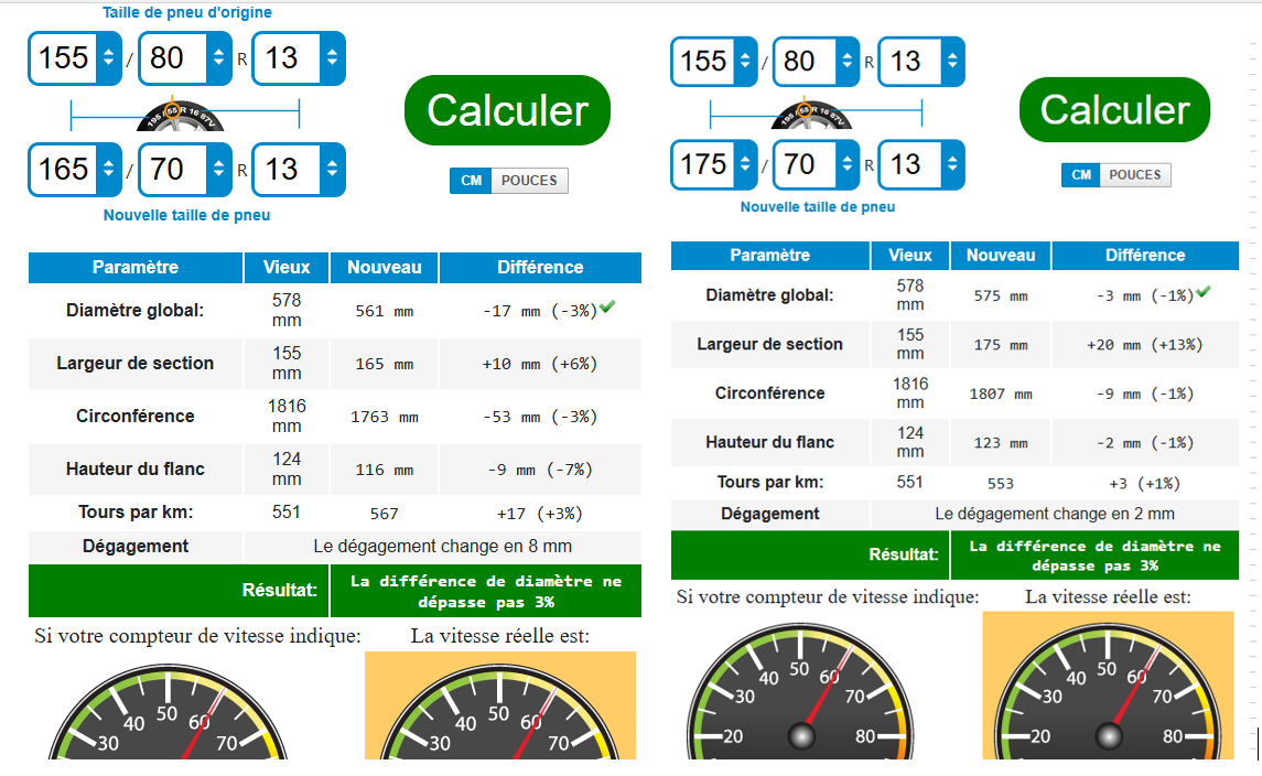 | Oui, c'est une réponse biaisée.. mais pas que.. ;) 165x13 = 170/80x13 = moins large & diamètre supérieur au 175/70x13 : pourquoi pas si ça passe dans les arches de roues considérant le déport négatif des jantes Revo. 165/70x13 = moins large & dia inférieur au 175/70x13 = moteur mouline + Ci joint le lien d'un calculateur sympa pour les pneus: https://tire-calc.com/fr/comparison/ |