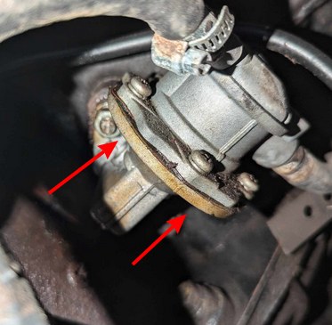 | Généralement c'est le joint de tête de pompe qui fuie. Le remplacer. J'ai déjà vu des versions caoutchouc ou liège. Les kits de réfection sont difficiles à trouver. Les fournisseurs préférant remplacer toute la pompe. J'ai opté pour boucher par une plaque et mise en place du pompe a essence électrique. Super et plus de soucis, ni frottement sur arbre a came. |