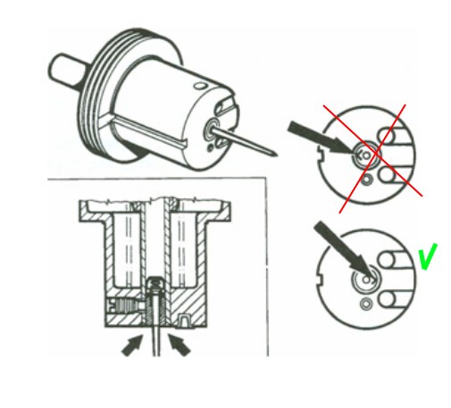 Pour la repose il suffit juste de transférer (reclipser) le petit ressort sur la tête de la nouvelle aiguille à l'aide d'un mini tournevis puis 1/ à la repose, orienter correctement le guide sur le piston (flèche repère centrée entre les 2 trous à dépression.photo)