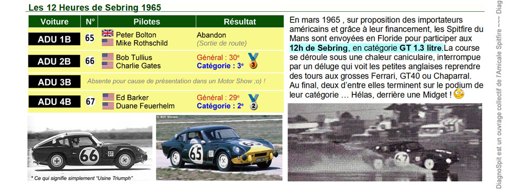 ADU 1, 2, 3 et 4B, présentes à Sebring le 27.03.1965 n'étaient pas encore disponibles pour cause de retour très probablement maritime (comme à l'aller). Ce sont donc 2 autres spitfires qui participent aux essais.