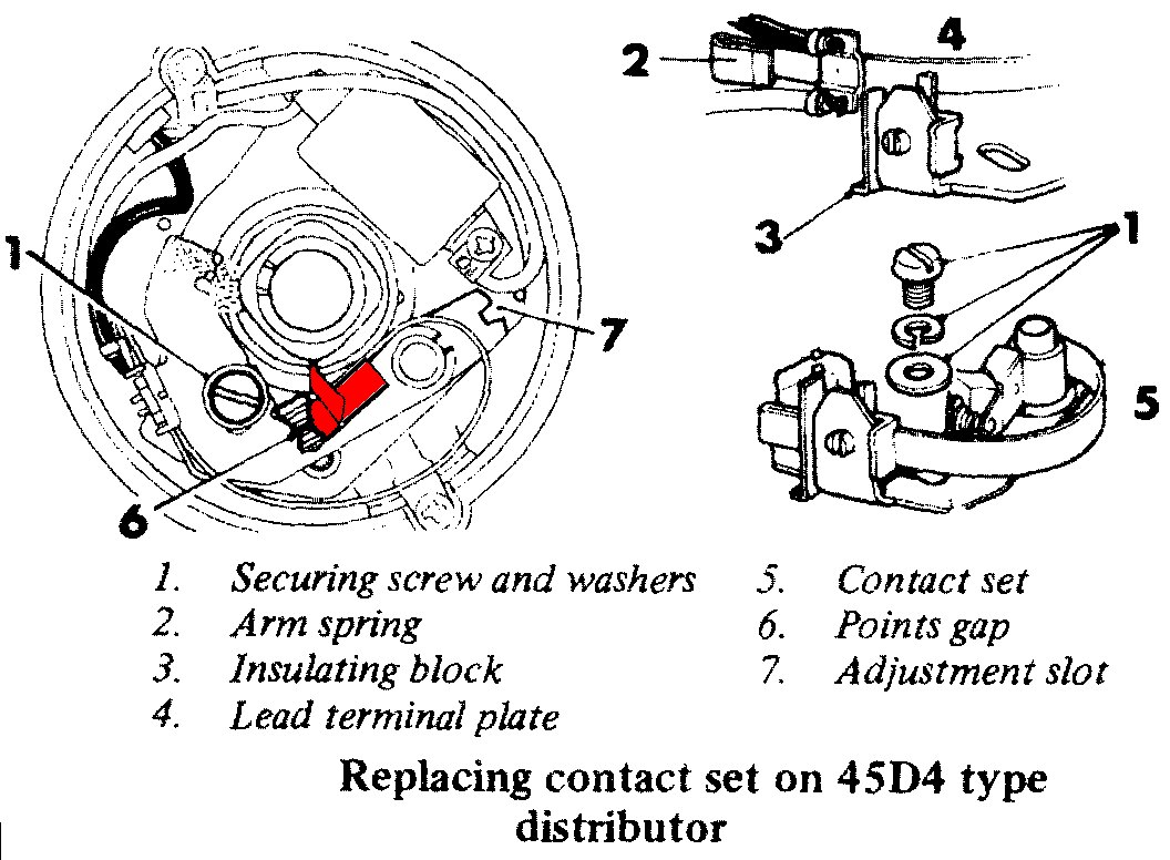 ![]() Patin (rouge) sur une pointe de came Débloquer vis 1 Ajuster l'écartement en 6 à l'aide d'un tournevis plat en 7 puis rebloquer la vis 1. (La cale de 0,4mm doit passer librement mais sans jeu) |