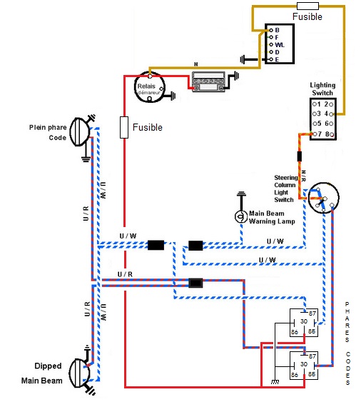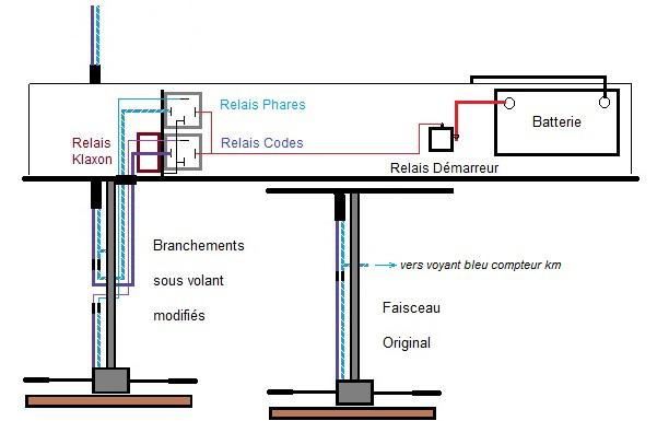 ![]() en effet c'est la maladie du circuit codes/phares, en vieillissant les contacts se relâchent, prennent du jeu, s'oxydent, le courant pas de moins en moins bien et puis cela finit par chauffer voir brûler (plusieurs cas connus). S'en parler du comodo qui peut représenter les mêmes dangers car tout le courant de puissance des codes et des phares passe par ces deux éléments. Bien sûr l'on pourrait se contenter de changer le contacteur mais cela ne ferait que repousser à plus tard le problème à plus ou moins longue échéance selon la qualité des nouveaux éléments. Donc le plus sûr est d'installer des relais pour les codes et les phares. En Bourgogne-Franche-Comté en 2018 on a fait un atelier qui a réunis 18 Amicalistes et on a installé des relais sur nos Spit à la chaîne, si tu veux je peux t'envoyer le doc réalisé à cette occasion. Voici déjà le dessin d'installation sans bouleverser le circuit d'origine, il suffit de shunter le circuit au niveau des fils sous la colonne de direction qui vont en direction du comodo : bleu/rouge pour les codes et bleu/blanc pour les phares |
