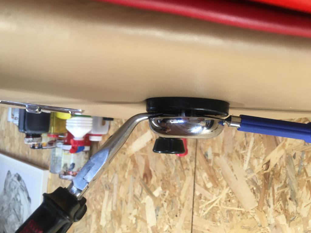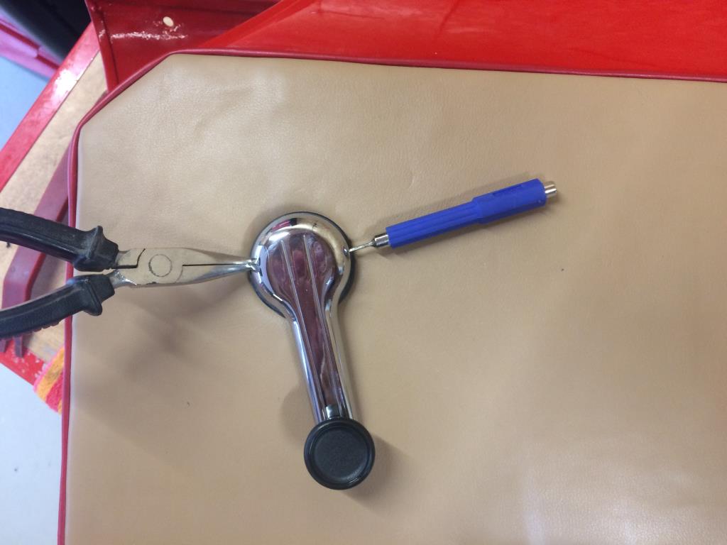 | Bonjour Je pense que le problème c'est de remettre la goupille C'est pas facile de comprimer le ressort tenir la poignée et mettre la goupille Moi je remonte le ressort , la rondelle et la poignée puis a la place de la goupille j'introduit dans le trou de la goupille un fil de fer ou une baguette de soudure de bonne longueur comme ça on l'a bien en main Après ca je présente la goupille en la tenant avec une pince a bec fins et en tapotant avec un pet marteau j'introduit la goupille qui repousse le fil de fer Pas plus compliqué Cdmt |