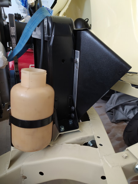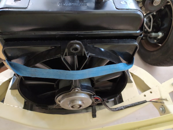 @Christ : pour l'instant plutôt au début. Je me suis fait un support avec les moyens du bord qui vient se reprendre sur des trous du chassis (à l'origine, je voulais me reprendre sous les pattes du radiateur mais je me suis lamentablement planté). il faut que je fasse encore 2 amortisseurs en caoutchouc à mettre sous les pattes du ventilo (ep. 3 ou 5mm).