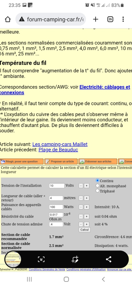 Effectivement je confirme qu'il y a un calcule à faire pour définir la section de fil. Il y a des sites pour camping car qui le fond très bien si besoin avec indication de la longeur et de l'amperage.