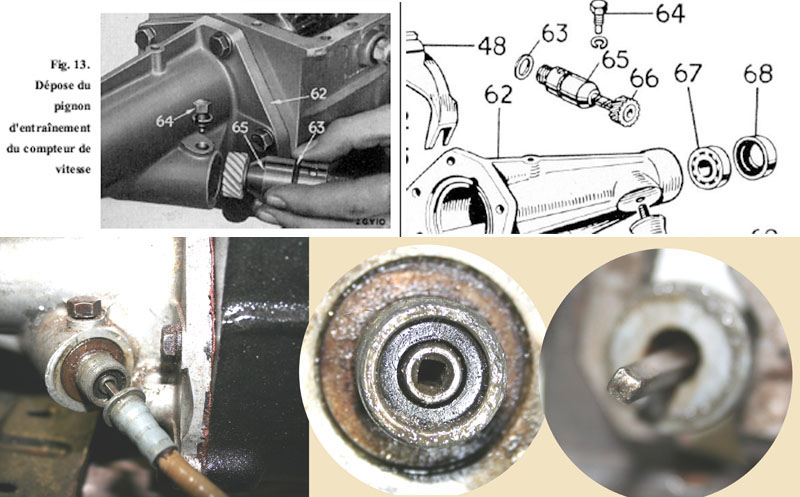 ![]() J’ai besoin de conseils pour dépanner mon compteur de vitesse (Vitesse 6) qui ne fonctionne pas. > Le câble tourne très librement dans la gaine > Le raccordement derrière le compteur est ok puisque l’aiguille se déplace sans à-coup en faisant tourner le carré du câble, côté boite, à la main. > Les parties mâle et femelle du branchement sur la prise sur la BV sont en bon état et s’emboîtent, bien graissées, avec un petit jeu. >>> J’en déduit que le problème est DANS la prise sur la BV. Si j’ai bon : > Faut-il sortir l’ensemble 63+65 (Fig 13) pour aller plus loin. > Suffit-il enlever la vis 64 pour sortir le pignon d’entraînement et y a-t-il des précautions à prendre pour ce démontage . Merci pour votre aide |