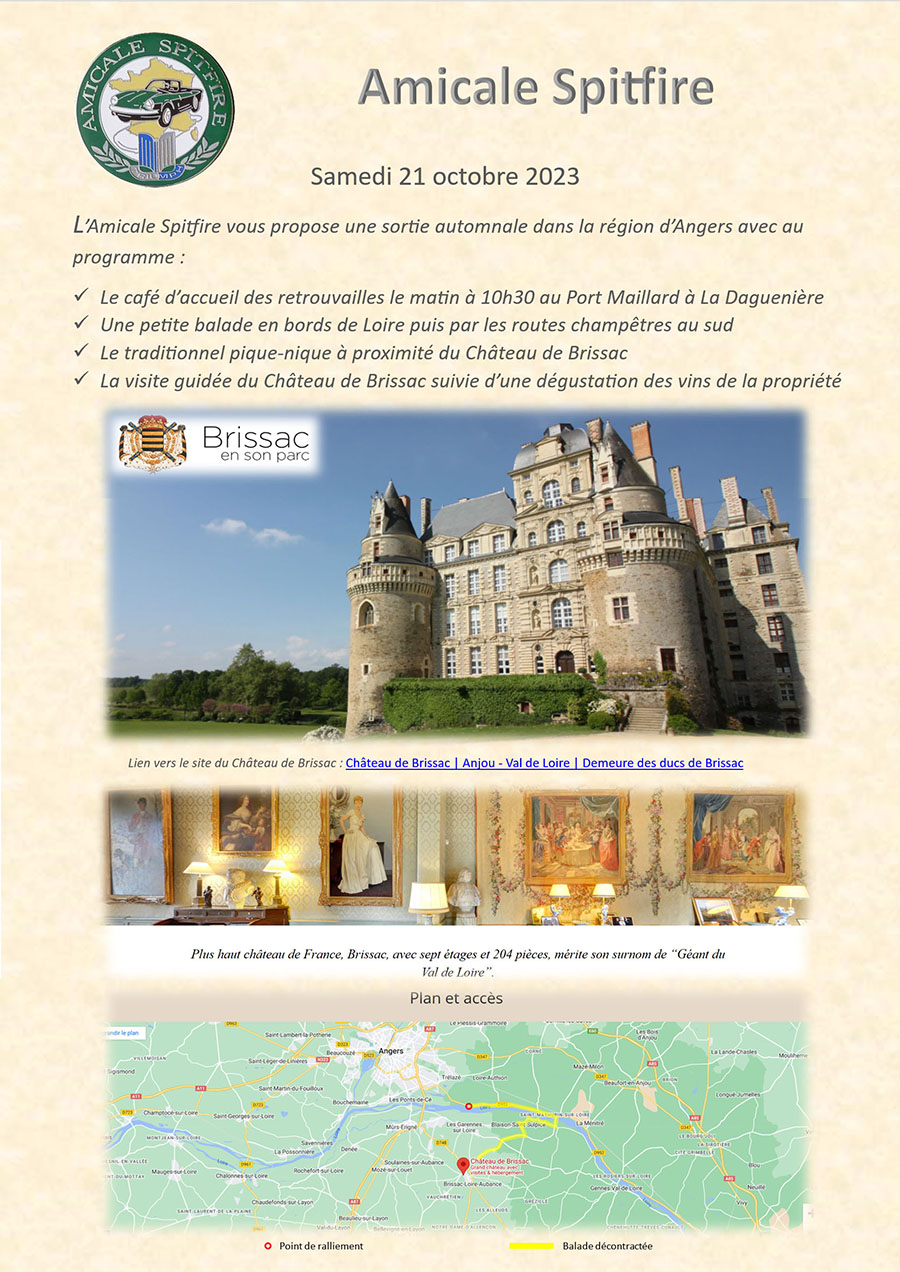 ![]() La région pays de la Loire organise une sortie au château de Brissac auprès d'Angers. Cette balade est programmée le 21 octobre. RDV à port Maillard à la Daguenière à 10h30. Les infos jointes donnent tout le déroulé de la journée. Si cela donne envie à certaines et certains, ce sera avec grand plaisir que nous partagerons ces bons moments. Bien amicalement. François |