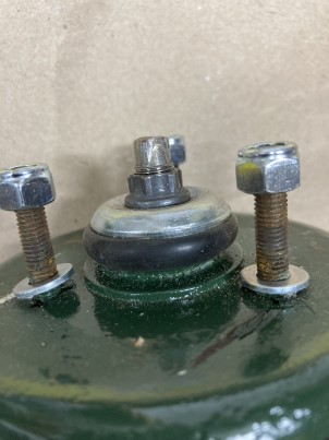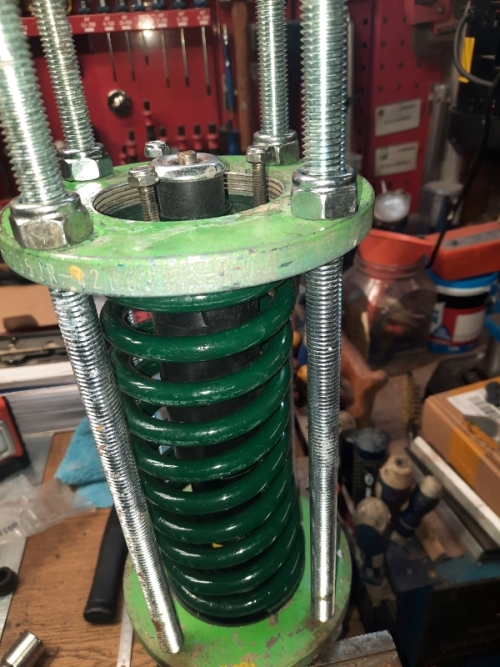 A la manière de compression du ressort, il te reste à compresser les silents bloc en appuyant sur la petite coupelle supérieure en fabricant une pièce qui vient coulisser dans tes tiges filetées et avec un trou en son milieu pour passer ton écrou et une douille.