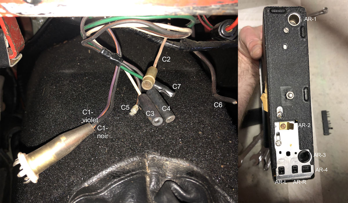 | C1 et C2 : rien à voir, c'est un porte ampoule Ar1 antenne Ar L HP gauche Ar R HP droit Ar 4 sortie +12v pour antenne télescopique ou alimentation d'un amplificateur auxiliaire Ar 3 entrée +12v Ar 2 masse Quant au C2 à C7, il faut chercher et tester les fils un par un. Assure toi qu'il fonctionne en le branchant sur établi et batterie. |