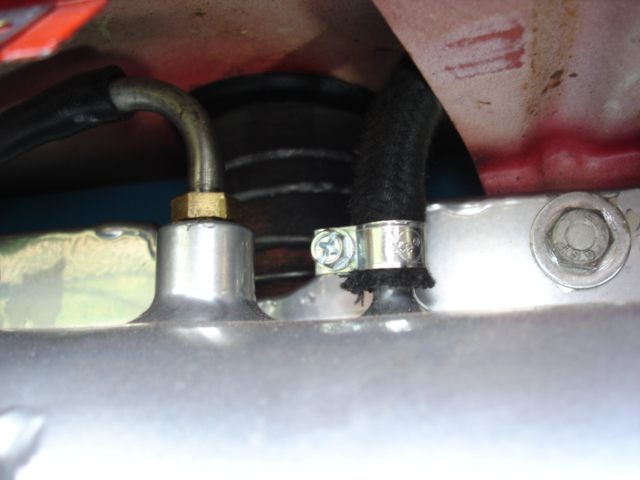 Photo N°1 la durite de gauche vers le moteur, la durite de droite avec un collier branchée sur la mise à  l'air libre du réservoir.