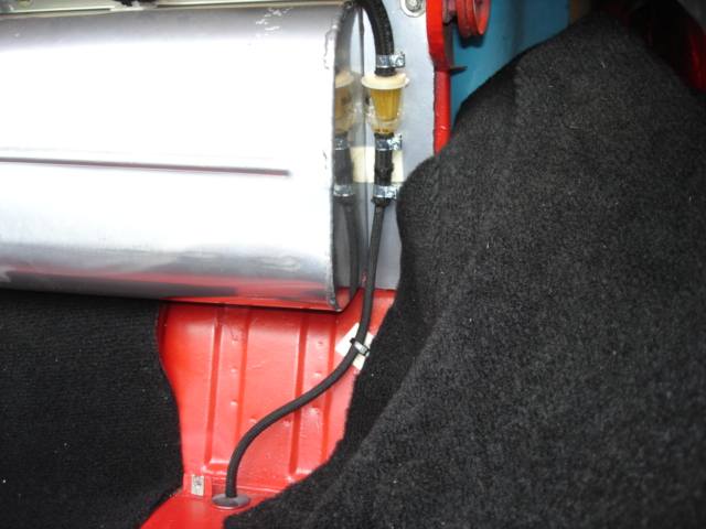 Photo N° 2, la durite avec le filtre contre le pollen ou la poussière depuis la mise à  l'air libre du réservoir jusqu'au passe fil au fond du coffre. En réalité c'est l'obturateur au fond du coffre que j'ai percé pour faire passer la durite. C'est symétrique au passage vers le moteur de l'autre côté.