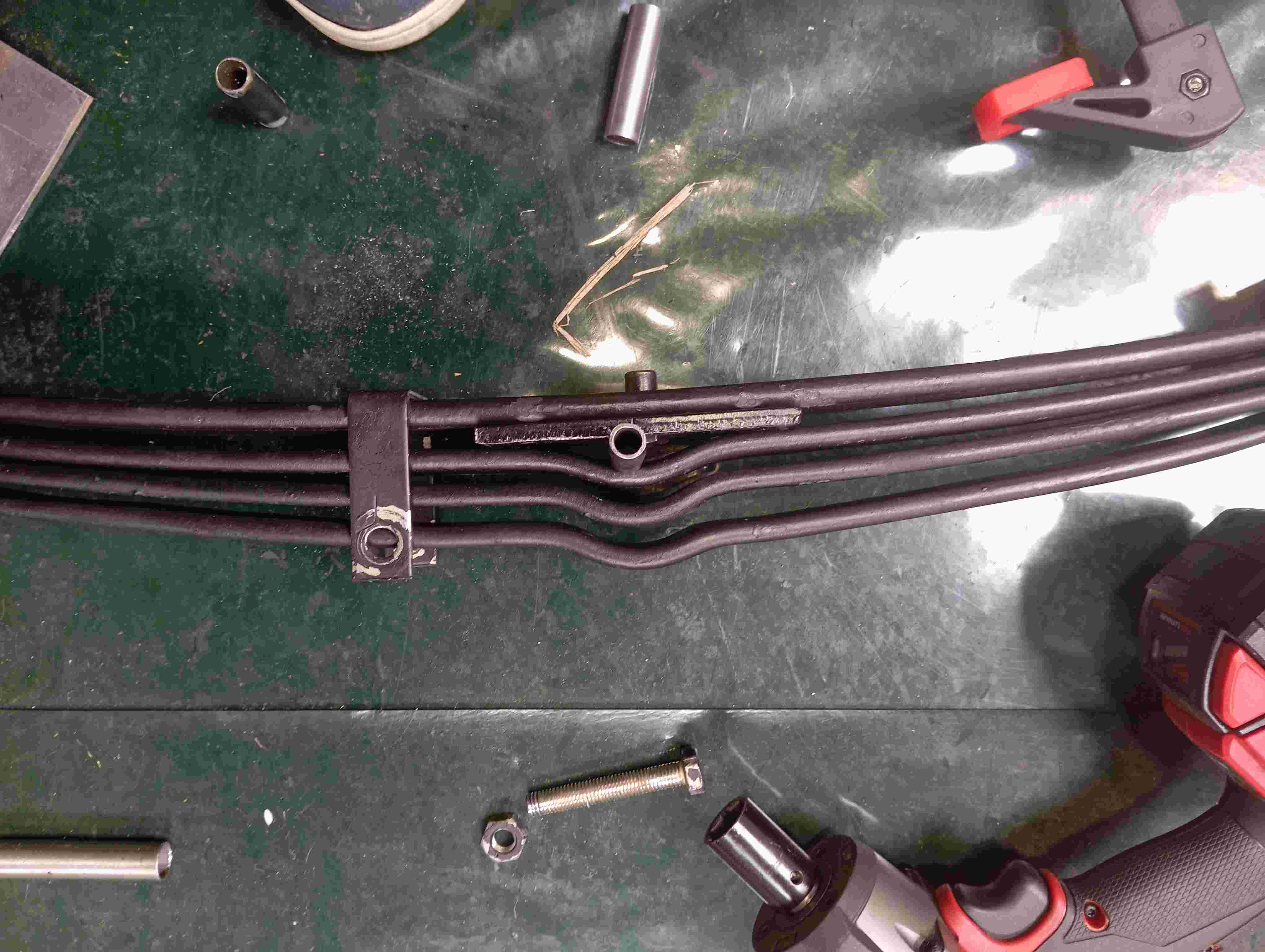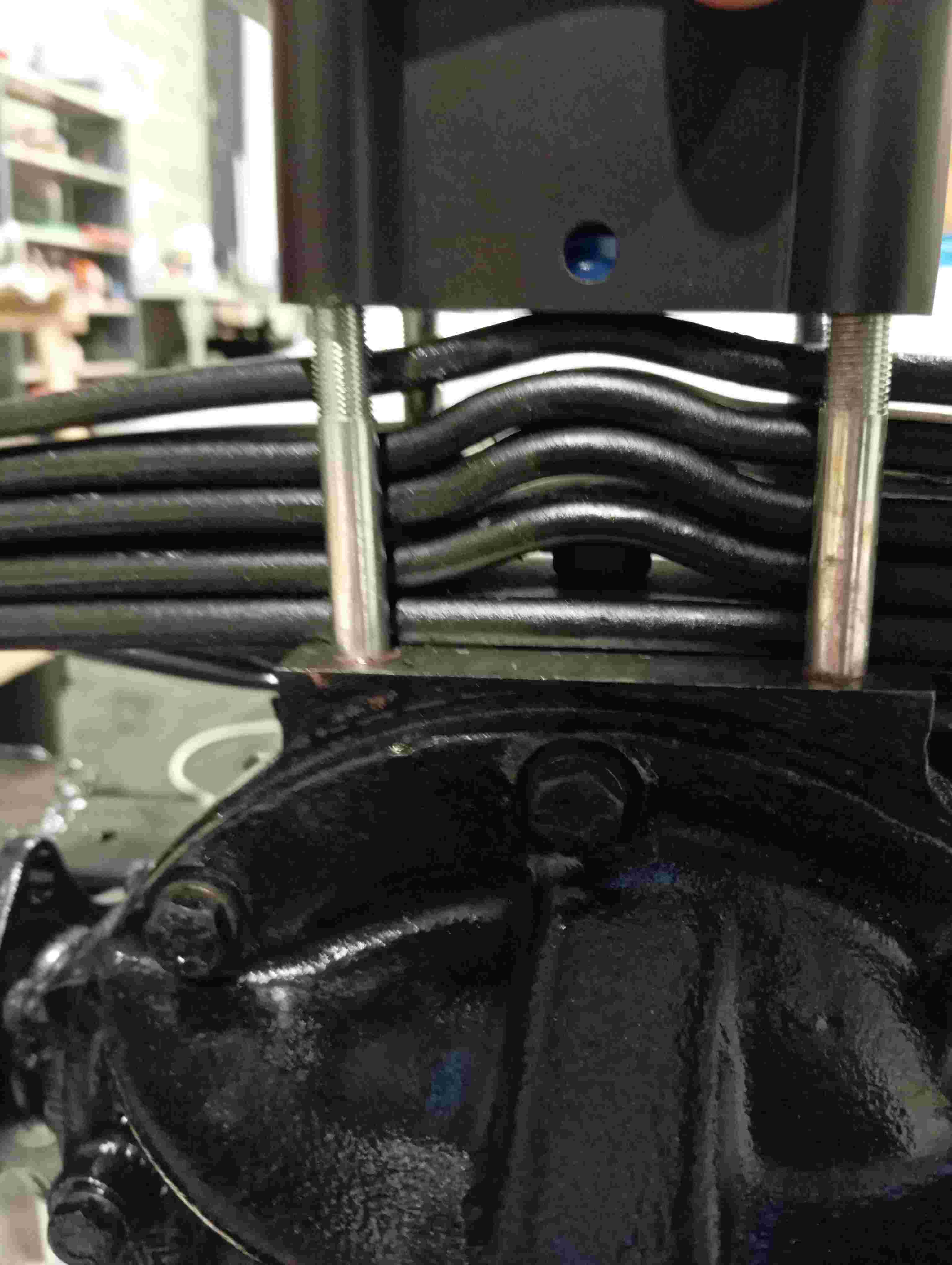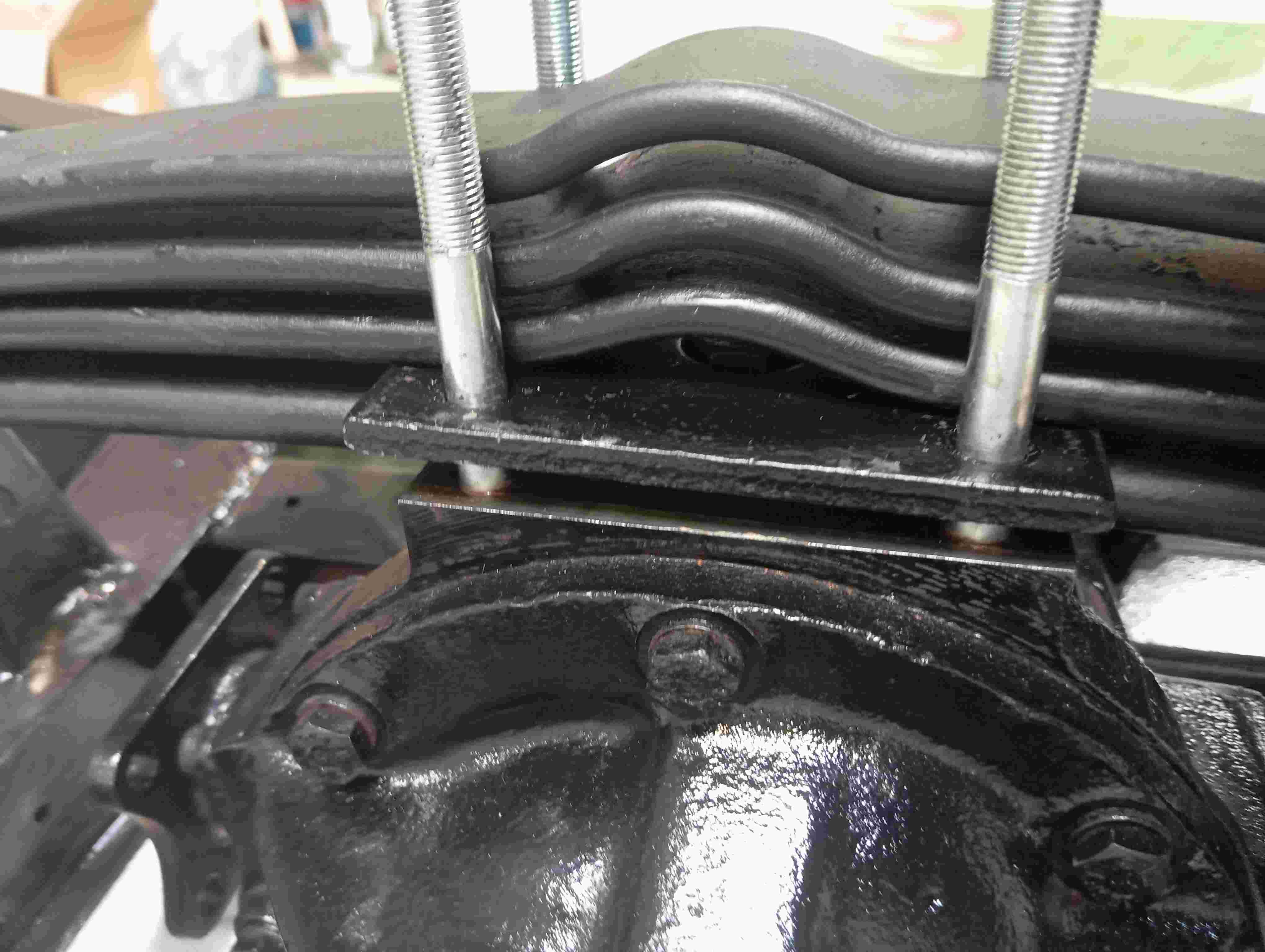La bride située à gauche du centre du ressort n'est qu'une bride "de transport" présente sur certains ressorts refabriqués. Elle permet de maintenir en place la lame supérieure lors de la manutention.