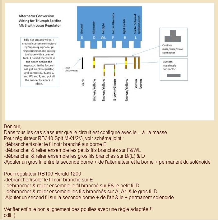| Bonsoir, @ Jpc & Demoulin, Oui c'est le branchement std pour effectuer la conversion. Les 2 fils de la dynamo viennent respectivement se connecter aux bornes IND (petite cosse) et "+" (cosse large) de l'alternateur. Bien s'assurer que la seconde fiche large sur l'alternateur est un + avant de doubler éventuellement le cablage positif. Le boîtier du régulateur peut servir de bornier si on souhaite conserver l'aspect d'origine. François avait réalisé l'adaptation ici: https://www.amicalespitfire.org/cyberspit/index.php?lecture=366561&debut=0&recherche=conversion+alternateur&rt=sg&page=1#366561 cdlt :) |