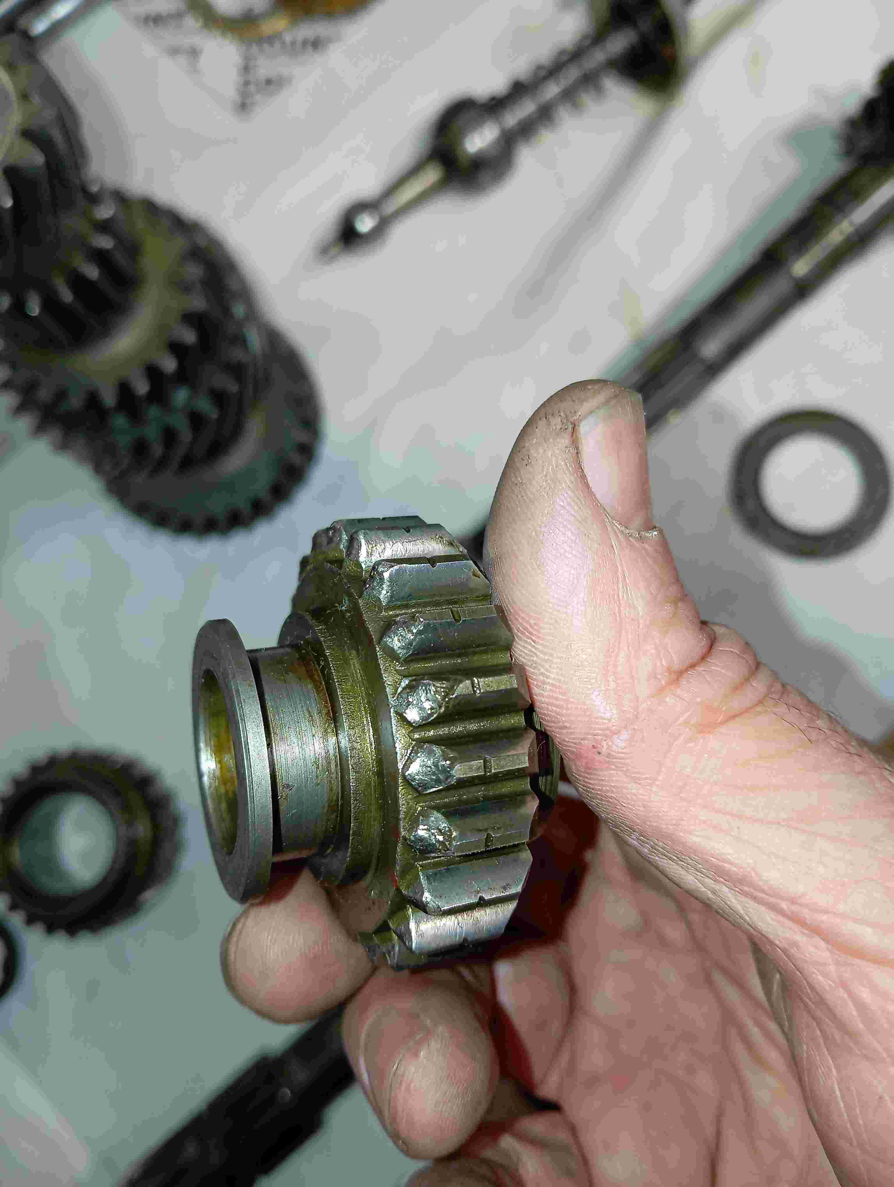 L'usure des dents sur le baladeur 1è/2è & pignon de MA peut être la conséquence d'un passage MA sans attendre l'arrêt complet du véhicule ou un souci d'embrayage qui lèche par ex.
