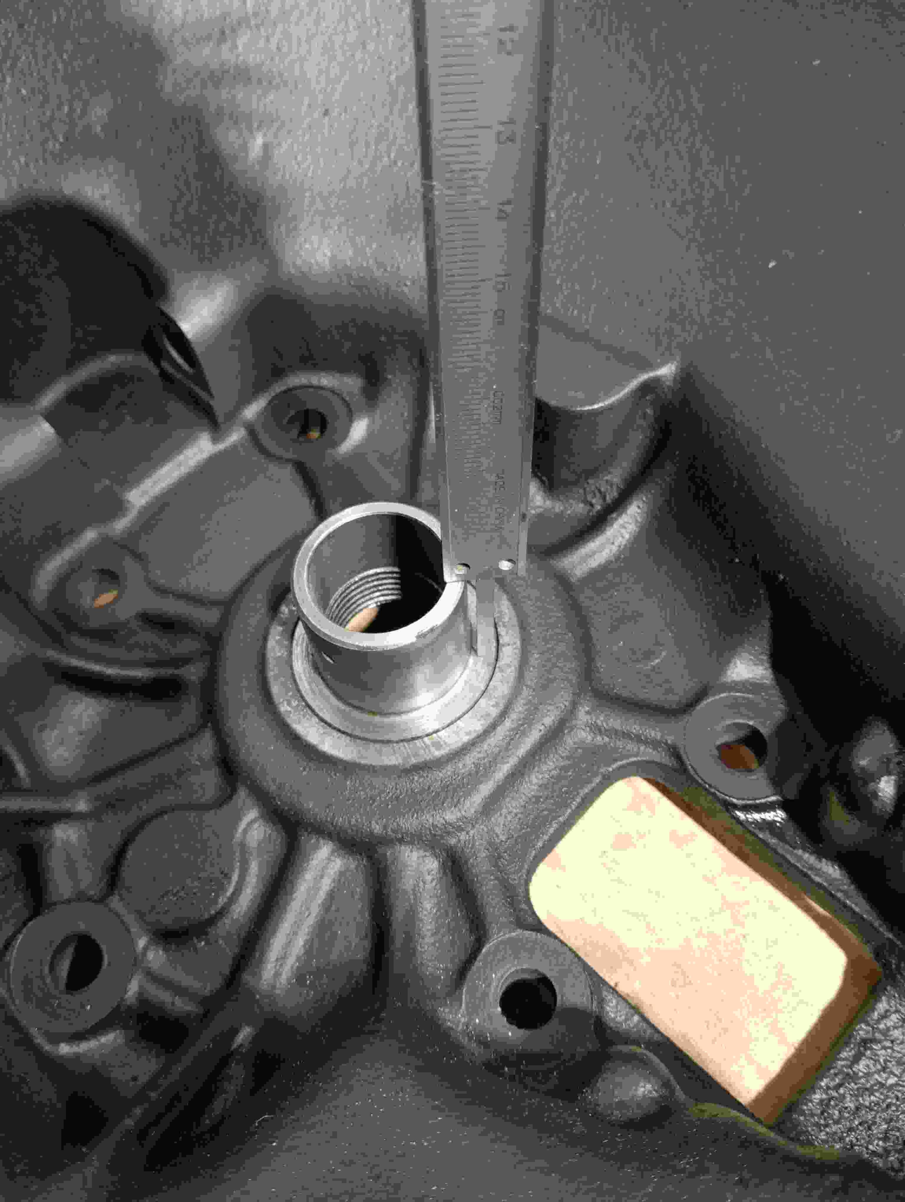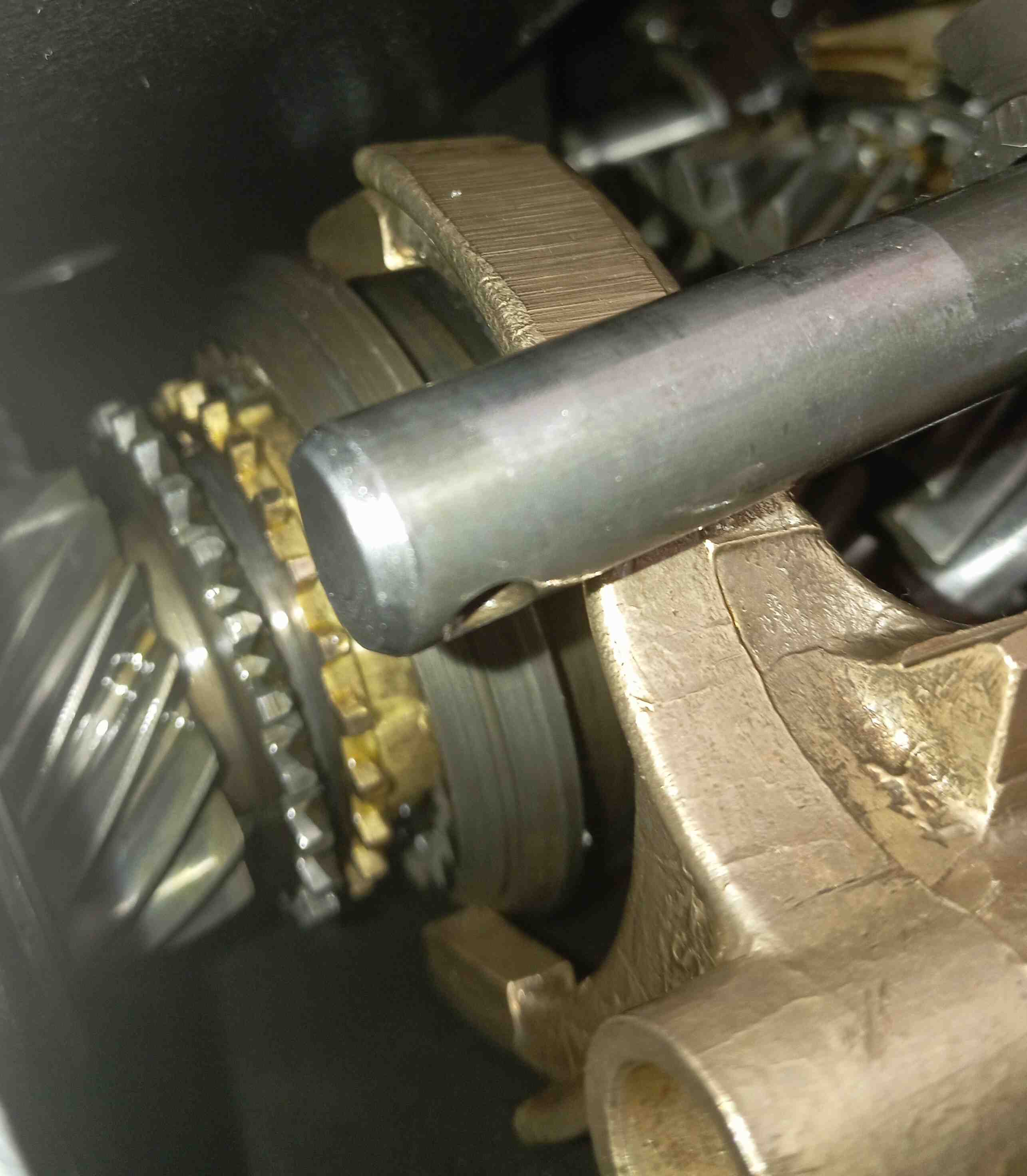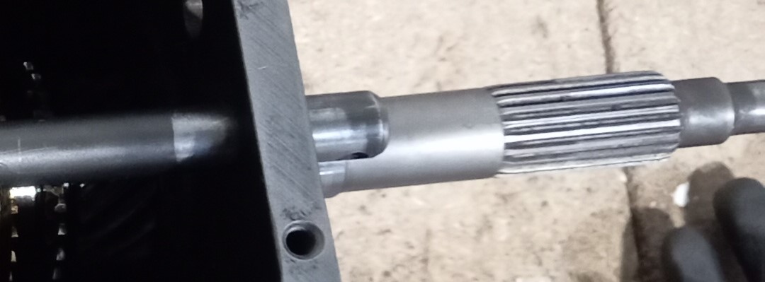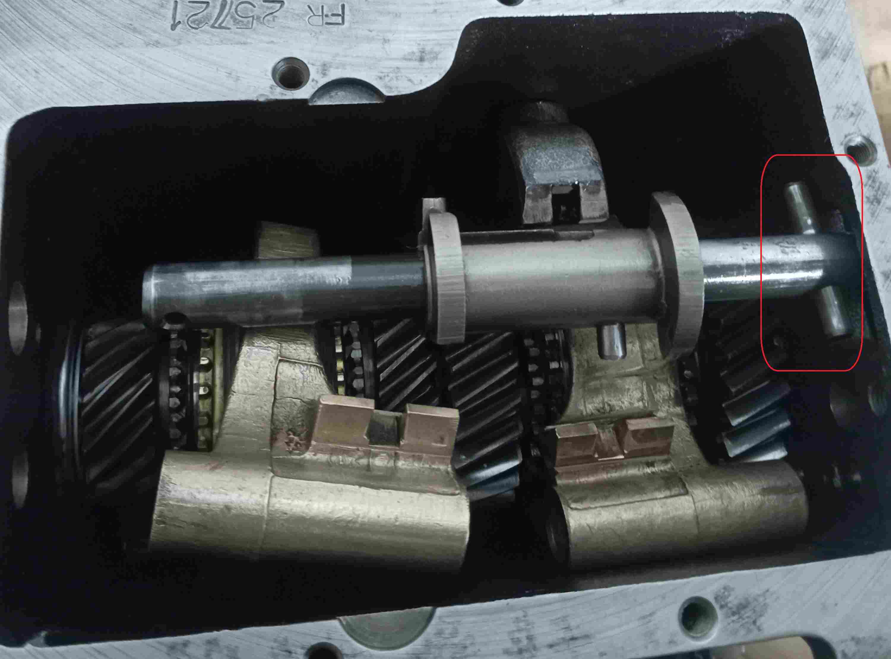 Possible l'empreinte de la goupille de sélection de fourchette, fixée sur l'axe principal, et donc un potentiel pb avec sa position ou son dépassement..