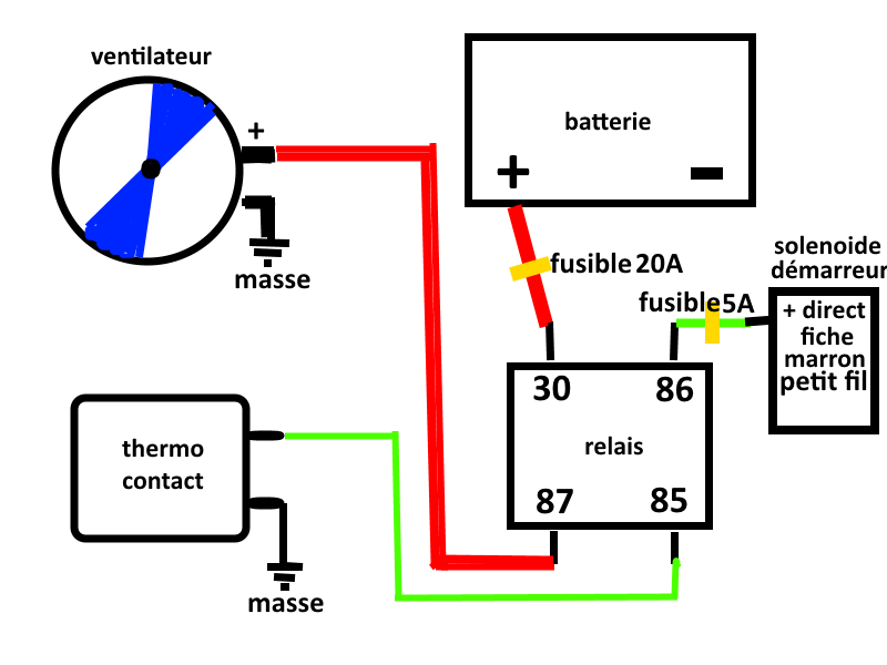 Vous mettriez le relais où? Sachant que sur le modèle que j'ai, il doit être à  proximité du thermocontact. Ce qui m'embête c'est le faux contact en cas de pluie.Le plus évident serait avec le réservoir de liquide de refroidissement. Pas loin de la batterie, un beau support dans un recoin et à  coté du radiateur. Par contre aucun câble n'arrive de se coté de la voiture, c'est pas top.
