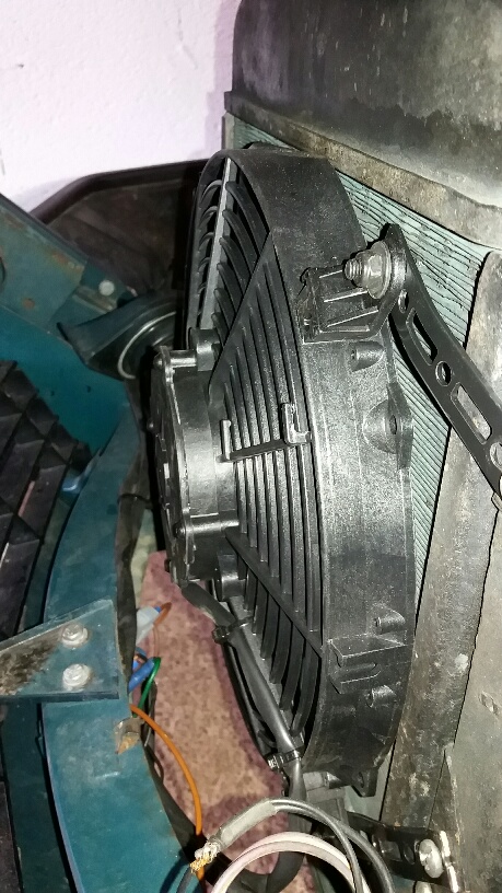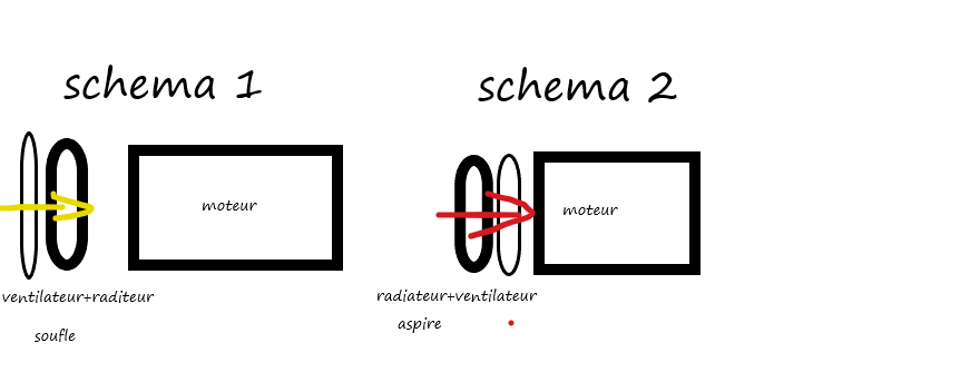 Ventilateur soufflant, sur le devant du radiateur ( origine aspirant, juste inverser la polarité ), montage a l'arrache, même le premier est a plus de 5 cms du radiateur, ben rien, pas de problème sur le perif au mois d'août, ou en track day.