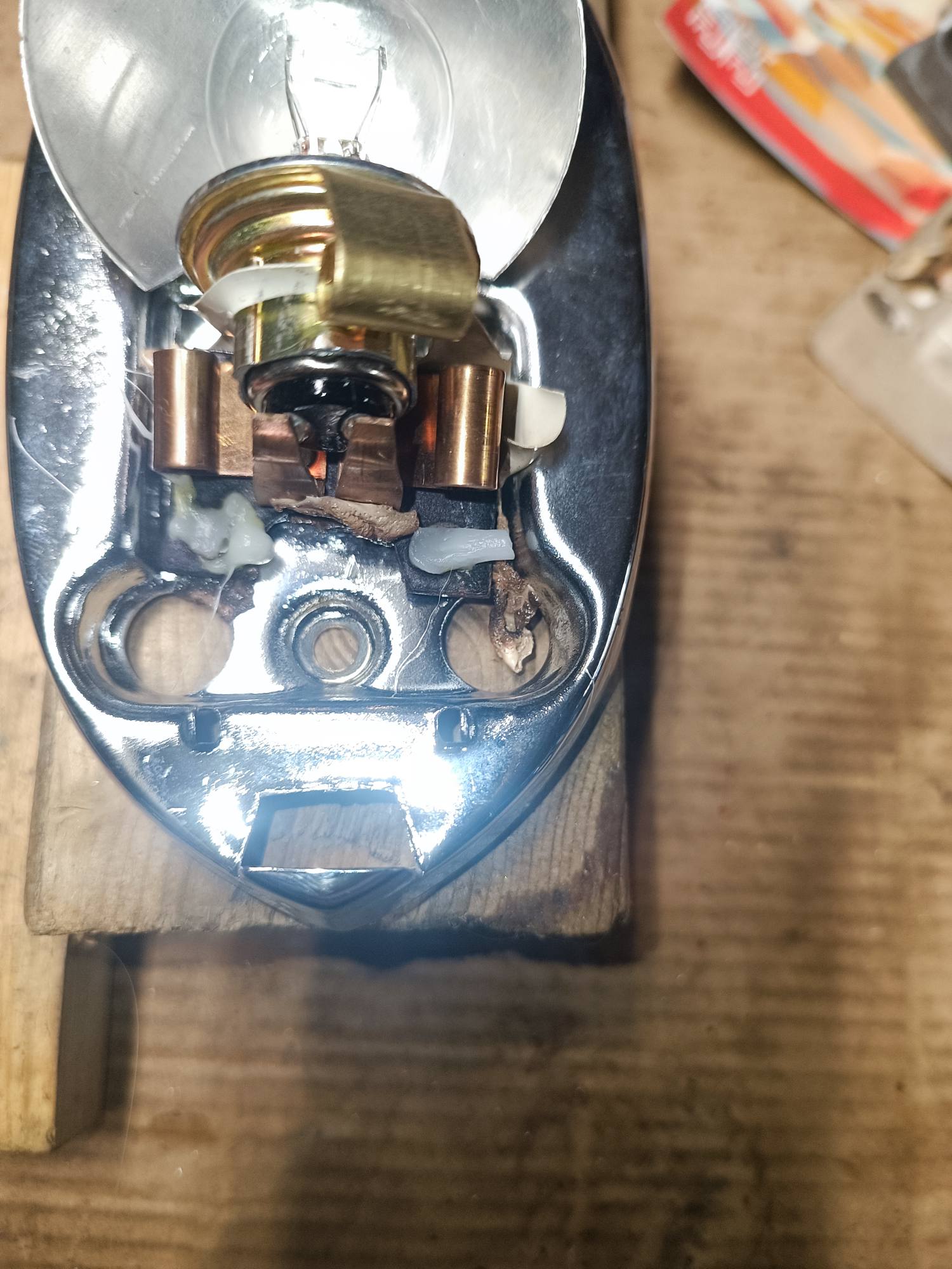 Ça m'énervait trop, ce mauvais isolement des feux. J'ai fait sauter les rivets en métal qui tenaient les cosses du stop et du feu. J'ai acheté sur eBay des tiges plastiques de 3mm. J'en ai coupé 2 morceaux, que j'ai mis dans les trous des rivets. J'ai ensuite chauffé au décapeur thermique pour faire fondre, et voilà, 2 feux avec un isolement parfait. Terminé, les fusibles qui chauffent sans savoir pourquoi.