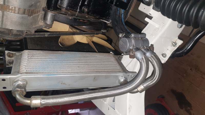 | Bonsoir, Oui remplir le radia en place et la tuyauterie au maxi. En principe c'est un montage "full flow" donc même à froid quand le thermostat est fermé il y a toujours une alim à débit réduit vers le radia. Par précaution supplémentaire on peut laisser desserré le raccord supérieur du radia et faire tourner le moteur au démarreur (+ bobine débranché) jusqu'à obtenir un suintement d'huile sans bulles avant de rebloquer. Dans tous les cas, par sécurité remplir le carter d'huile au repère maxi de la jauge et faire tourner au ralenti jusqu'à ouverture du thermostat du radia huile (huile à env 80°) pour finir de purger le système. S'assurer ensuite de compléter le niveau dans le carter. @Quantik, ce positionnement est effectivement moins répandu/classique mais c'est le montage std usine pour la GT6. cdlt :) |