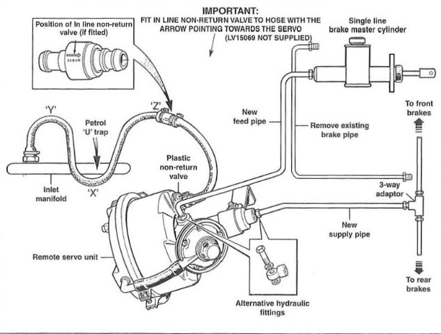 ![]() Possible, c'était monté aussi sur les Sunbeam et Lotus Elan. @Belgium, Simple ou double circuit importe peu, oui sur les 2 servos il y a une entrée (MC) & une sortie (union 3 voies vers les étriers) . Le branchement ne doit se faire que sur les freins AV comme c'est le cas sur le montage d'origine . Le circuit des freins AR ne se connecte pas au servo/ne passe pas par lui. Le servo de remplacement doit être monté incliné selon un certain angle. Idem concernant l'orientation de sa soupape à air. cdlt :) |